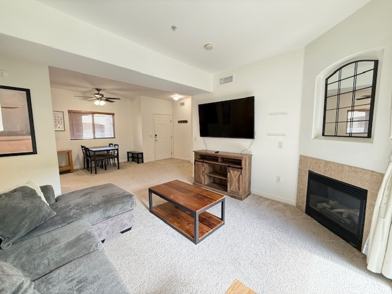 Rare find in the Rancho Mission Trails Community! This beautifully furnished 2-bedroom, 2-bath condo offers a spacious, light-filled floorplan with a welcoming living room featuring a cozy fireplace and private balcony. The kitchen shines with granite countertops, abundant cabinetry, and top-of-the-line stainless steel appliances including a gas range, dishwasher, built-in microwave, and refrigerator with ice maker and water dispenser. Designed for privacy, the bedrooms and bathrooms are positioned on opposite ends of the home; the generous primary suite includes a king-size bed, while the second bedroom is ideal for guests or a home office. Enjoy central heating and air with a smart ecobee thermostat, in-unit washer and dryer, walk-in closets, and flat-screen TVs in the living room and primary bedroom. Two assigned covered garage parking spaces are included, along with resort-style community amenities such as a gated entry, pool, spa/hot tub, BBQ area, clubhouse/rec room, exercise room, playground, and recreation areas. Don’t miss this opportunity, call us today to schedule a tour. Sorry, no pets.