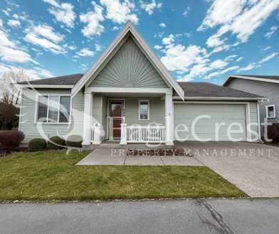 Welcome home to this beautifully designed 3-bedroom, 2-bath home offering 1,636 square feet of comfortable living space in a charming neighborhood near scenic walking paths. Featuring hardwood flooring throughout and a neutral color palette, this home is filled with natural light from large windows that create a warm and inviting atmosphere. The open-concept living and dining area is highlighted by a cozy gas fireplace with an elegant decorative mantle and modern remote-controlled ceiling fan fixtures. The spacious kitchen boasts cream-colored cabinetry, a large island with breakfast bar seating, corner pantry, and stainless steel appliances including an electric stove, microwave, dishwasher, double-door refrigerator, and garbage disposal. The generous primary suite offers a large walk-in closet and a luxurious on-suite bathroom complete with a deep soaking tub and expansive walk-in shower. Additional features include a utility room with washer and dryer hookups and extra storage cabinets, a two-car garage with ample shelving, and a lighted outdoor patio just off the dining area—perfect for relaxing or entertaining.