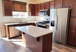 On the main level you will find the kitchen/living room combo with a half-bath. The kitchen features stainless steel appliances, quartz countertops and lots of cabinets. Through the sliding glass door, you will enjoy a private patio that overlooks the beautiful and vast Nevada desert.