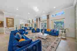 Casa Monte Grande is a private luxury estate inside the gated Estates at La Quinta, set on an expansive, beautifully landscaped property that feels more like a boutique resort than a single home. Inside, the spaces are generous and thoughtfully designed: a grand foyer with iron double doors and a chandelier, a designer blue-and-gold chef’s kitchen, a comfortable great room that opens to the pool, a dedicated indoor bar, and a cozy theater lounge with reclining leather seats. The primary suite feels like its own apartment, with a king bed, a fireplace, and a full sitting area with sofas, plus direct access to the patio. Every bedroom has its own ensuite bathroom and walk-in closet, and one wing of the home functions as a flexible family suite with multiple beds. Outside, Casa Monte Grande unfolds into a true oasis with a freeform pool and spa, large lawns, mature palms, a circular fire pit with built-in seating, a BBQ grill and shaded patio lounge for outdoor meals, and a unique wooden deck perched above a tranquil pond and waterfall. It’s a place designed for groups who want space to spread out, gather, relax, and genuinely enjoy being at home in the desert. *Rental rates vary by month, so please contact us for availability and pricing. Security Deposit: A refundable security deposit is required and will be collected prior to your stay. Full details provided upon booking. For long-term rentals, a California lease must be signed. Each rental includes utility caps for electricity, water, and gas, and the guest is responsible for any overages. The signing of the lease agreement must occur within 21 days of booking, provided the check-in date is more than 30 days away. If the check-in date is less than 30 days from the booking date, the lease agreement must be signed within 5 days of booking. Pets: Pets are subject to approval. Pet cleaning fees apply and vary depending on the breed and size. *Work vehicles are not permitted to be parked inside the community. The space From the moment you step through the wrought-iron double doors, Casa Monte Grande feels open and welcoming. The entry is bright, with high ceilings, tall windows, and a chandelier that sets a quietly grand tone. Straight ahead, the great room draws you in with deep blue velvet sofas, a stone accent wall, a fireplace with a mounted TV above, and wide views of the backyard. The room flows naturally into the kitchen and dining areas, making it easy for everyone to be together without feeling crowded. The kitchen is one of the showpieces of the home. It features an oversized island with waterfall-style countertops and velvet bar stools, white cabinetry with gold hardware, double ovens, a gas cooktop, and a large built-in refrigerator. Two mosaic chandeliers hang over the island, giving the space a warm evening glow. Just off the kitchen, a glass-wrapped breakfast area looks out onto the palms and gardens, while a formal dining area nearby seats a larger group comfortably and keeps meals connected to the heart of the home. The house includes several spaces designed purely for comfort and entertainment. One wing holds a dedicated theater lounge with four leather recliners arranged before a large TV and modern fireplace — ideal for movie nights or quiet downtime. Another room serves as a full indoor bar lounge, complete with custom shelving, bar seating, and tall windows that make it bright during the day and atmospheric at night. A foosball table adds a casual, fun touch without ..