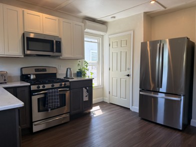 Beautiful third-floor unit with renovated kitchen w/quartz counters, new appliances (fridge, microwave, dishwasher). In-unit laundry, mini-split heat/AC, hardwood floors, fresh paint. Front & back porches, off-street parking. Water/sewer included. Internet included.