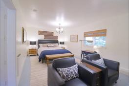 Comfortable queen bedroom + cozy sitting area