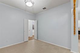 The fifth bedroom is a flexible space that can easily serve as a game room, media room, home office, or additional bedroom — tailored to your needs. A custom accent wall with open birdcage-style railing overlooks the stairway, adding architectural character and openness to the game room area.