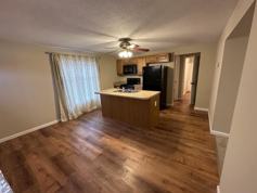 The spacious living room connects to a kitchen with an open floor plan. The kitchen features appliances such as a refrigerator, oven, stove, and microwave.