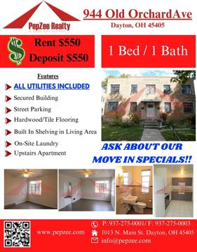 Amazing 1 bedroom, 1 bathroom apartment in Dayton. Amenities included: laundry facilities are on site, public transportation, hardwood flooring, built in shelving, easy access to rt35, i-75, and secured building. Utilities included: electricity, heat and water. Is pet friendly. Date Available: Feb 23rd, 2026. $550/month rent. $550 security deposit required. Please submit the form on this page or contact PepZee Realty at 937-270-0001 to learn more. This property is managed by a responsible landlord using Avail landlord software.