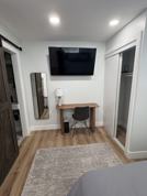 Inside, the home features new flooring, fresh paint, and modern upgrades throughout. The remodeled kitchen includes custom cabinetry, quartz countertops, and stainless steel appliances. The fully tiled bathroom features a glass-enclosed shower. A dedicated laundry area with washer and dryer is included.