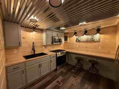 This apartment has a modern kitchen with beautiful butcher block countertops.