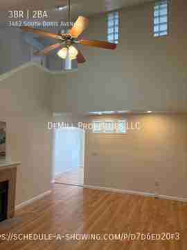 Available February 27, 2026, this 1,503 square foot, 3 bedroom, 2 bathroom home at 3462 South Doris Avenue in Springfield features dramatic two-story ceilings flowing into the kitchen and dining area, creating an open and airy living space. A bonus space ideal for a home office adds flexibility, while the spacious primary suite provides a comfortable retreat.