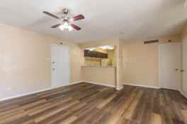 This studio features hardwood-style flooring, granite-style countertops, and dark wood cabinets with brushed-nickel finishes. Our community of flats and townhomes offers numerous amenities including a resident center with foosball, billiards, WiFi and resort-style pools!