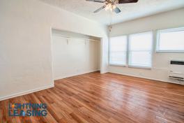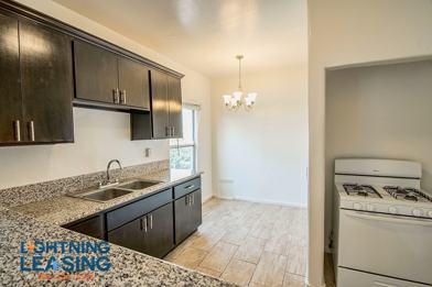 The kitchen is equipped with a stove and oven and provides practical cabinet space for everyday use. The open floor plan allows for flexible furniture arrangements to suit your lifestyle.