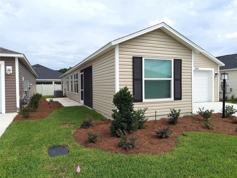 Village of Deluna! New LVP floors throughout. Perfect Emerald Patio Villa with one car garage and separate golf cart garage. Screened front lanai with ceiling fan is ideal for outdoor dining and relaxing. Open living area provides great flow through the living, dining and kitchen areas! Island kitchen has plenty of storage, built in desk, stainless appliances and inside laundry. Primary suite includes large bedroom and ensuite bath with walk in shower, double sinks and linen closet. Guest room has wall closet and is adjacent to guest bath with tub/shower combo. White cabinetry in kitchen and both bathrooms keep everything light and bright! Available April 2026.
