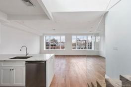 Available immediately. The Penthouse unit at 368 Gates is an immaculate living space with a luxurious combination of natural light and high-end finishes. The Penthouse is a true 2-bedroom, 2-bathroom condo embedded within Bed-Stuys finest boutique condominium building to date. Features of this near 23-ft. wide apartment include over 1,300 sq ft. of pristine living space, 4-inch select oak hardwood floors, northern and southern exposure, central heat/air, an in-unit washer/dryer, a deeded storage unit, a Nest system, Sonos surround sound, smart wiring, a large private balcony, and a private rooftop deck. The Penthouse features a double height ceiling enclosed by three massive windows throughout the hallway, which adds to the light and airy nature of the space and accented by Pendent hanging lights. Up the interior stairs to the landing and out the double sliding glass door awaits your 630 sq ft private rooftop oasis that has been fully decked out. This Southern facing deck features stunning daytime and evening views of Brooklyn and Manhattan. A pair of massive triple-pane Pella ProLine windows that quietly overlook Gates Avenue anchors the open concept living and dining room. The kitchen is equipped with an eat-in peninsula, white quartz marble countertops, self- closing white shaker cabinetry, and a suite of top-line stainless steel appliances from Bertazzoni, Bosch, and Fisher & Paykel. Located in the rear of the unit, lie a pair of large bedrooms and two immaculate bathrooms. The master bedroom boasts a customized walk-in closet, access to the homes private south-facing balcony, and an en-suite bathroom that features radiant heated flooring, Carrara hexagonal marble tile, custom dual-vanity sinks, Duravit wall hung toilet, and a deep soaking Kohler tub. The second bedroom possesses its own large closet and sits adjacent to a beautiful full bathroom that has a large vanity, subway tiled walls, a marble floor, and a spacious walk-in shower.