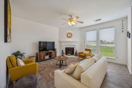 The spacious kitchen is a true centerpiece, complete with a large island, abundant cabinetry, and plenty of prep space, all opening seamlessly to the inviting living room with a cozy fireplace. Natural light fills the home, creating a warm and welcoming atmosphere.