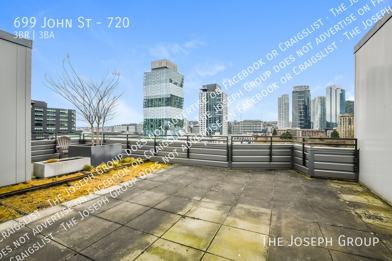 Experience elevated city living in this top-floor penthouse 3-bedroom home overlooking downtown Seattle. The spacious main living area features dramatic lofted ceilings and floor-to-ceiling windows that frame stunning city views while filling the space with natural light. Step out onto the private balcony to take in the skyline from above. The kitchen is designed for both functionality and style, offering a large island with built-in storage, abundant cabinetry, and stainless steel appliances - ideal for entertaining or everyday living. In-unit laundry adds convenience, while the primary bedroom includes a private ensuite bathroom and generous closet space. Enjoy exclusive access to your own private rooftop deck, plus a shared community rooftop complete with a grill - perfect for gatherings with panoramic views. Residents also benefit from premium building amenities, including 24/7 gym access, a community room with a pool table, and one assigned parking space in a secure garage. Residents are responsible for electric, and a flat monthly fee of $190 covers water, sewer, and garbage. Sophisticated finishes, unbeatable views, and full-service amenities - this is Seattle living at its finest.