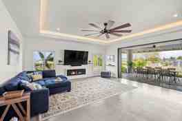 Designed with an open-concept floor plan, the home features a custom chef’s kitchen equipped with high-end appliances, generous prep space, and quality finishes throughout. Expansive sliding pocket doors create a true indoor-outdoor experience, opening to a spacious outdoor living area complete with a relaxing jacuzzi—perfect for entertaining or unwinding under the island sky.
