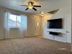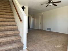 Two bedrooms, 1.5 bathrooms town house style. Carpet through-out, with linoleum flooring located in the kitchen, dining room, and bathrooms. U-Shape Kitchen with white appliances, built in microwave, and Formica countertops. Half bathroom downstairs with cultured marble vanity countertop. Full bathroom upstairs with cultured marble vanity countertop. Ceiling fans in bedrooms. Washer/Dryer hook up in garage. Evaporative cooler and forced air heating. Small fenced in backyard patio area.
