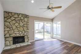 The primary suite includes a ceiling fan and a patio slider door, leading to a private en-suite bathroom with a shower, dual vanities, and a dressing area with mirrored closets/wardrobes. Stepping outside through the patio slider door reveals a generously sized backyard, complete with a gas BBQ and grill island, ideal for outdoor dining, gardening, or simply enjoying Southern California's mild climate year-round.