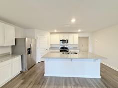 The kitchen features a massive center island with granite countertops and a dual-basin sink, a large pantry, and stainless steel appliances including a double-door refrigerator, flat-top range/oven, built-in microwave, and dishwasher. The spacious living room flows seamlessly from the kitchen, creating a bright and inviting space for family gatherings.