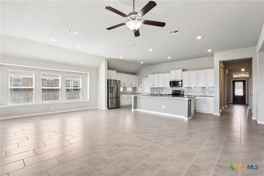 Beautifully well maintained one story home in Comal ISD, open floor plan with tile floors throughout common areas, lots of windows, ceiling fans in every room, large kitchen island, granite countertops, tons of cabinets, stainless steel appliances including a refrigerator, large pantry and laundry room, primary bedroom with full bath including garden tub, separate shower, double vanity and large closet, large covered back patio that looks out into the hill country with no neighbors behind. Easy access to IH 35 and FM 306, community pool is just a few doors down. Sidewalks, hiking and biking trails throughout neighborhood.
