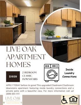2 Bedroom/ 2 Bathroom, Downstairs (Classic Style) Inside Laundry Connections Lease it now before it's gone! In Person Tours Available Today! Contact us today. View a virtual tour here! https my matterport com show ?m=uLApW5owzws&dh=0&help=1 Applications available online at www liveatliveoak com Live Oak Apartments 1900 Oakdale Rd Modesto, CA 95355 Amenity list: ✦Upstairs, 2 Bedroom 2 Bath (Classic Style) ✦Dual Pane Windows ✦Open Concept Floor Plan ✦Pool and Spa ✦Assigned Covered Carport ✦24-Hour Emergency Maintenance ✦24/7 Card-Operated Clothes-Care Centers ✦Pet friendly *breed restrictions apply* ✦Short Term Leases *with an upcharge* ✦Furnished Available *monthly up charge* ✦Conveniently located near Shopping Centers, Hospitals, HWY 99, & Restaurants! ✦$500 Deposit on approved credit ✦Life-sized Chess and Checkers ✦Community Garden ✦Accepts Credit Card Payments ✦Applications online at www liveatliveoak com Rental Qualifications: Credit History: All accounts are in good current standing. Credit score will determine the deposit. Rental History: At least 6 months of favorable rental history or home ownership. Friends or family are not valid rental history. Late payments, NSF, lease violations or evictions may result in denial. Less than 70% of on-time payments may result in denial. First-time renter program available with a 6-month initial lease term when all other requirements are met. Income: At least 6 months of consistent verifiable income. Gross monthly income must be 2.5 times the monthly rent. Examples: 30 days of most recent pay stubs from employer, new job offer letter-signed and dated, benefits award letter-dated within the last 60 days, Self-employed- must provide 2 most recent years of signed tax returns with Schedule C. Call or stop by today! VIP Apartment Management, Inc. Corporate License: 02130378