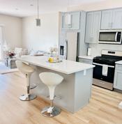 Modern kitchen fully equipped with refrigerator, dishwasher, microwave, and stove/oven