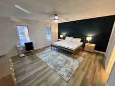 Enter through your covered porch into your recently renovated home. To your left is the smaller of the 2 primary en-suites. This bedroom is highlighted by a wall of windows beaming with nature light overlooking the front of the home, and includes queen bed (foam mattress) with 32in TV, 2 night stands with lamps, and a large closet with french doors. Attached bathrooms jack-and-jills with the hallway and includes tub/shower combo and luxurious gold finishes.