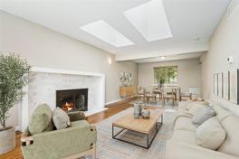 The home features multiple living areas, including a formal living and dining space with hardwood flooring, a fireplace, and skylights that provide abundant natural light. The updated kitchen includes granite countertops, stainless steel appliances, a walk-in pantry, and a peninsula with additional seating.