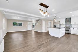 The main floor features a spacious open-concept living room filled with natural light, seamlessly connected to a modern kitchen with a large island, pantry, and stainless-steel appliances, including a refrigerator, microwave, dishwasher, and gas stove. Two bedrooms, a full bathroom, and a convenient laundry room with washer and dryer hookups complete the main level.