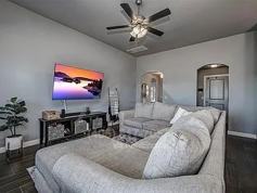 The open-concept kitchen is a chef’s dream, featuring sleek quartz countertops, a large island perfect for gathering, and a stylish tile backsplash. It comes fully equipped with stainless steel appliances, including a gas stove, oven, microwave, dishwasher, disposal, and refrigerator. Storage is never an issue thanks to the spacious walk-in pantry.