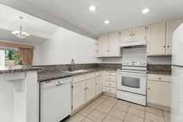 The kitchen offers generous cabinetry, ample counter space, and direct access to the dining area, ideal for everyday living and entertaining. Both bedrooms are well proportioned, including a spacious primary suite with en suite bath.