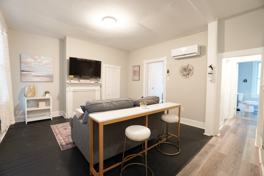 Unit C is a fully furnished 1 bedroom apartment found on the 2nd floor of this renovated triplex. near Olde Towne Portsmouth. Queen Size Bed (bedding included) and 2 closets in the bedroom. Living is open to the kitchen with pantry nook, and full closet for storage. The kitchen is fully equip with fridge, oven, range, microwave coffee maker and fully equip for cooking with dishes and essentials. Full sized couch, SmartTV with Internet/Wifi and Bar top for barstool seating are also featured in the living area. Full bathroom with stand up shower with towels included for your convenience. There is a washer and dryer in the common area of the building for use as available. You will love this fresh new space with a small back yard. Lots of parks near by and Olde Towne shops and restaurants within walking distance. Utilities and Internet included in monthly rent.