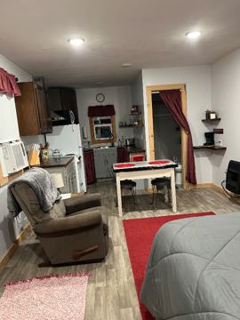 The living area is designed for absolute comfort, with a La-Z-Boy recliner, a side table, and a dedicated desk area that works well for remote work or focused projects. The full kitchen features a stove and oven, a full-size refrigerator, a stainless steel sink, solid walnut countertops, and ample cabinet space. Cooking is made easy with a microwave, toaster, coffee maker, tea pot, cookware, and starter baking essentials already provided. An eat-in table with two chairs keeps meals relaxed and straightforward. The private en-suite bathroom includes a walk-in shower, soft linens, and practical storage. Climate control is handled by a wall-unit heating and cooling system, with an additional gas wall heater for extra warmth on cold mornings.