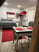 Inside, the studio is new, clean, and well-organized, with everything in a single, comfortable, and easy-to-use layout. Bright lighting keeps the space open and cheerful, while table lamps and retro pendant lights provide softer lighting when you want to unwind. The sleeping area features a full-size bed with a pillow-top memory foam mattress and high-thread-count cotton linens, creating a restful place to recharge. A built-in closet organizer offers generous shelving and hanging space, supported by under-bed storage, a laundry basket.
