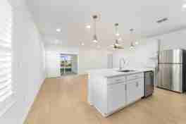 Inside, you’ll love the bright open-concept layout with luxury vinyl plank flooring throughout, recessed LED lighting, plantation shutters, and stylish finishes throughout the home. The designer kitchen is the heart of the home, featuring a large center island, quartz countertops, shaker cabinetry, herringbone backsplash, pantry, and stainless steel appliances—ideal for everyday living and entertaining guests.