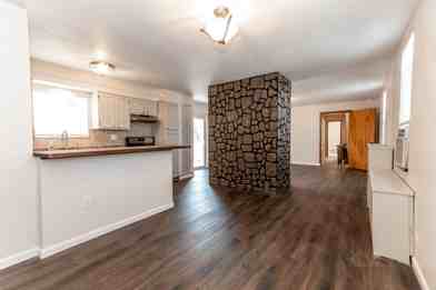 The updated kitchen features brand-new appliances and a bartop peninsula, opening into a bright open-concept living and dining area anchored by a beautiful stone chimney feature that adds warmth and character to the space.