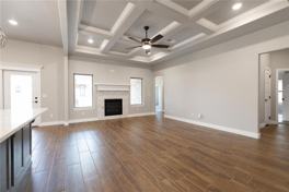 This defining home offers 4 bedrooms, 3 bathrooms, 2 covered patios, a large bonus room, and dedicated gym. The spacious living room features a stunning coffered ceiling, a stacked stone surround center gas fireplace, wood-look tile, large windows, and Cat6 wiring. The high-end kitchen supports custom-built cabinets to the ceiling, impressive tile backsplash, built-in stainless steel appliances, a center island equipped with a trash can pullout, impeccable pendant lighting, a walk-in pantry, and 3 CM countertops. The primary suite offers a sloped ceiling detail, windows, a ceiling fan, our cozy carpet finish, and 2 separate walk-in closets. The attached primary bath features separate vanities, a free-standing tub, a private water closet, and a huge walk-in shower! The covered back patio offers perfection with its wood-burning fireplace, gas line, and TV hookup. Storm shelter and in-ground sprinkler system!