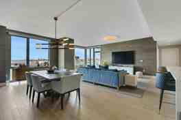 Welcome to unparalleled luxury in this exquisite penthouse at the prestigious Nine on The Hudson. Spanning an expansive 1,893 square feet, this residence embodies sophisticated urban living with open views and resort-style amenities. Three well-appointed bedrooms with abundant custom cabinetry provide exceptional space and comfort, with one featuring a convenient Murphy bed for added versatility. The separate den is perfect for a home office, library, or media room. The open-concept, custom-designed layout offers a generous living and dining area, ideal for entertaining or relaxing with family. Floor-to-ceiling windows flood the space with natural light and showcase beautiful views of the uptown Manhattan skyline. The state-of-the-art kitchen is a chef’s dream, boasting Bosch and Thermador appliances, sleek oversized quartz waterfall countertops, and custom cabinetry. Custom built-in closets in every room and additional custom built-in in primary suite. First-class amenities include a full-time concierge, a five-star fitness center spanning multiple floors, a pool, a sunning deck with a barbecue area, a children’s playroom, an impressive residents’ lounge, and a rooftop oasis. This penthouse home offers the ideal blend of style, function, and comfort in one of the Gold Coast’s most sought-after luxury buildings. 2 covered garage parking spaces included.