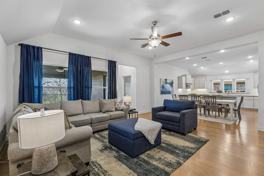 The bright kitchen features white cabinetry, a large island, pantry, abundant cabinet storage, stainless steel appliances, and a refrigerator included. Natural light fills the home, creating a warm and inviting atmosphere. The spacious primary suite offers a private retreat with a walk-in closet, dual vanity, walk-in shower, and direct access to the covered back patio. Two additional bedrooms and a full bath provide comfortable accommodations for family or guests. Enjoy simulated wood flooring and tile throughout—no carpet. A separate utility room includes a washer and dryer for added convenience. Situated on a private lot backing to a greenbelt, the home features a fenced yard and covered patio, creating a peaceful outdoor space to relax and unwind. Lawn care is included in the rent, making maintenance easy and convenient.