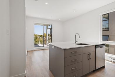Suites feature stainless steel appliances including a full-size fridge, stove, dishwasher, and microwave, paired with minimalist cabinetry, bright wall finishes, large windows and durable vinyl plank flooring throughout. Every unit also includes a full-size in-suite washer and dryer conveniently located in a separate closet.