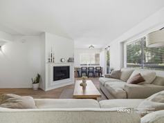 The living area feels bright and welcoming thanks to wide windows and light-toned flooring. A fireplace adds visual warmth to the room, creating a natural focal point for relaxing evenings or casual gatherings. Nearby, the dining area sits beside large windows and a glass door that leads toward the balcony, letting daylight pour in and keeping the space airy and cheerful. In the kitchen, white cabinetry, generous counter space, and stainless steel appliances support everyday cooking with ease.