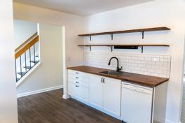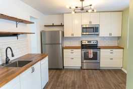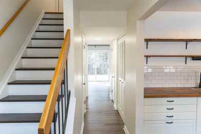 The main level includes luxury vinyl plank flooring and fresh paint, creating a bright and welcoming atmosphere. The farmhouse-style kitchen features white cabinetry, oak veneer countertops, stainless-steel appliances, an extra-deep sink, and custom open shelving with a tile backsplash, blending modern convenience with warm character.