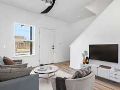 This modern townhome duplex in Dignowity Hill offers spacious, sunlit living with an open-concept design. The living room features large windows, hardwood floors, and a sleek kitchen that boasts stainless steel appliances, ample counter space, and a stylish island. Upstairs, two bright bedrooms provide plenty of walk-in closet space, complemented by a luxurious bathroom with a soaking tub and separate shower. Enjoy the convenience of off-street parking and a private, fenced-in backyard. A gate has been added to the front of the property.