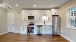 Enter via a private mudroom with a large coat closet. The main level features an open floor plan with a custom Shaker kitchen boasting quartz countertops, stainless steel appliances, space for a dining nook and living room, plus in-unit laundry hookups for a stackable washer/dryer—all with street views.