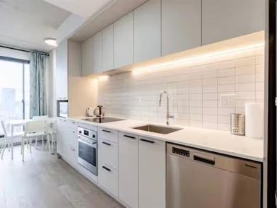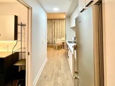 New fully furnished unit including electricity, hot water, kitchenwares and a locker. Big Fully furnished new studio downtown condo -modern finishing style with Living area 326sqft - 8 Appliances including air conditioning & microwave oven. Walk 5 mins from metro stations of "Beaudry" , 8 mins from Berri-UQAM. Next to CHUM(Hospital), UQAM, Chinatown, Old Montreal, Restaurants, Berri Autobus terminal, -biggest city center library. Well equipped gym, Lounge, BBQ area, Outside swimming.