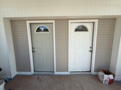 Both entrances are covered, offering protection from the weather year-round. The front entrance opens into a vestibule, creating a transition space that helps keep the interior comfortable while providing an extra layer of privacy and protection from the elements.