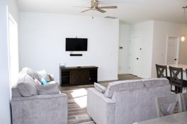 The home features an open-concept layout connecting the living room, dining area, and kitchen — creating a comfortable and inviting space for everyday living. The kitchen includes quartz countertops, modern cabinetry, and ample counter space.
