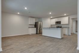 Inside, luxury vinyl plank flooring runs throughout the 1,791 square foot home. A wide entryway welcomes you into the spacious, open living and kitchen area. The kitchen is designed with both style and function in mind, featuring a large center island with dual-basin undermount sink, a walk-in pantry, and abundant cabinet and counter space. Stainless steel appliances include a French door refrigerator with bottom freezer drawer, smooth-top stove, built-in microwave, and dishwasher.