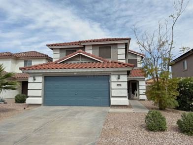 No Application Fees! Spacious 4 bedroom, 3 bathroom Buckeye home located in the Sundance community offering an open floor plan and upgraded interior finishes. This home features wood laminate flooring throughout with no carpeting, two tone neutral paint, excellent natural lighting, and a large open living room with direct backyard access that flows into the kitchen and dining area. The updated kitchen includes generous countertop space, island with breakfast bar, refinished cabinetry, stainless steel appliances, and dining area. One bedroom and full bathroom are located on the first floor. The remaining bedrooms are located upstairs along with a large loft, including the oversized primary suite with walk in closet, double sink vanity, additional linen closet, and large garden tub. Washing machine and dryer are included. The two car garage features epoxy flooring and built in cabinets for additional storage. The backyard includes an extended covered patio and private pool, providing great outdoor living space.