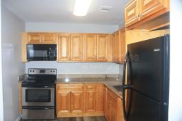 The kitchen features granite countertops, solid wood cabinetry, stainless steel appliances, and ample cabinet and counter space. Both bedrooms are generously sized with large windows and good storage.