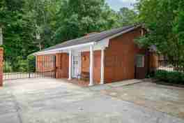 Welcome to 615 Pinecrest Drive, Manchester, GA, where classic charm meets modern comfort. This delightful brick home is nestled amid lush greenery, offering a serene retreat just minutes from the heart of the city. The exterior features a gated entrance and a beautifully manicured lawn, providing both security and curb appeal. Step inside to find a spacious living area highlighted by vaulted ceilings with exposed beams and a stunning stone fireplace, perfect for cozy evenings. The open floor plan seamlessly connects the living space to a sunlit dining area, creating an inviting atmosphere for both relaxation and entertaining.